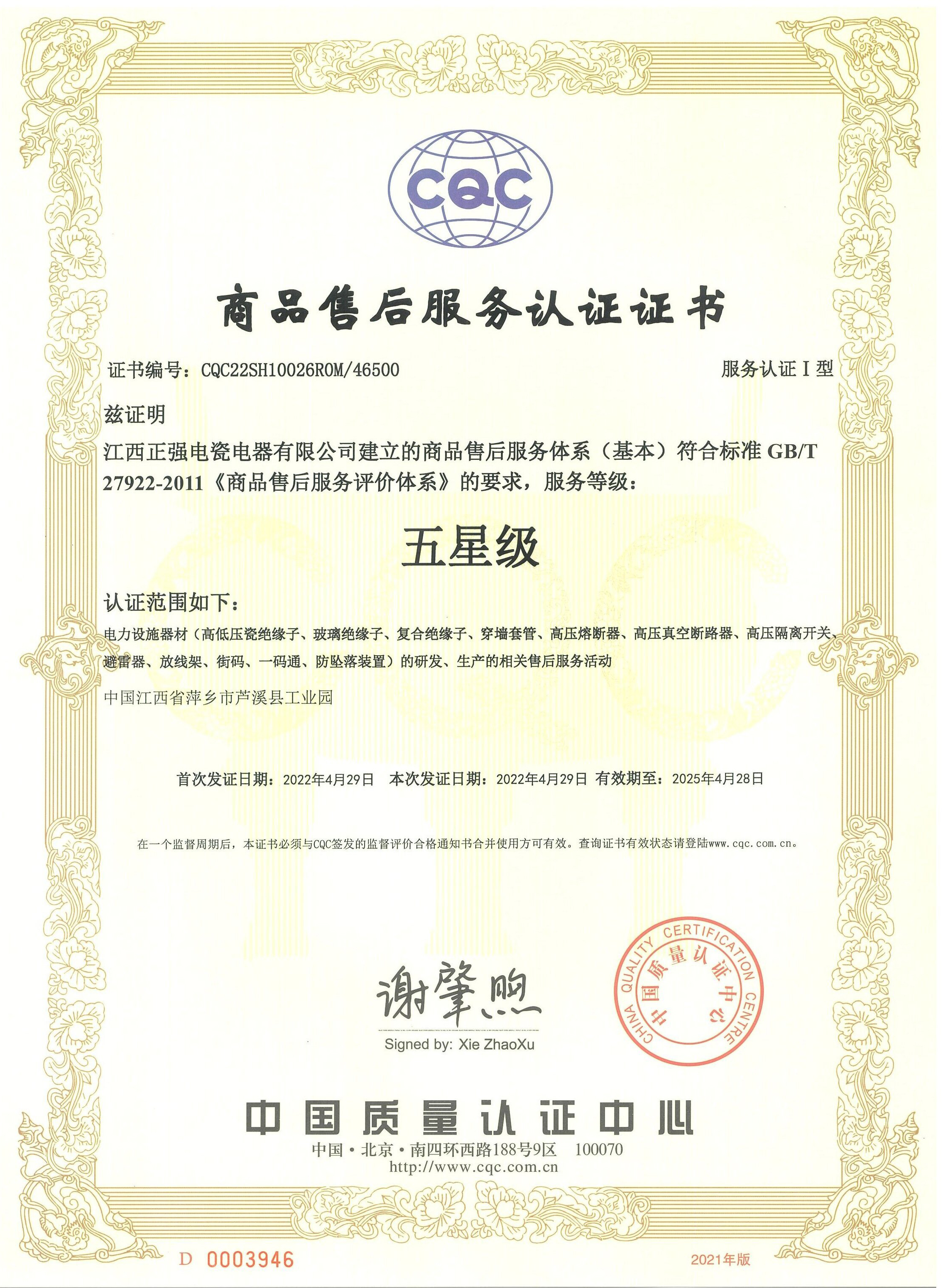 商品售后服务认证证书