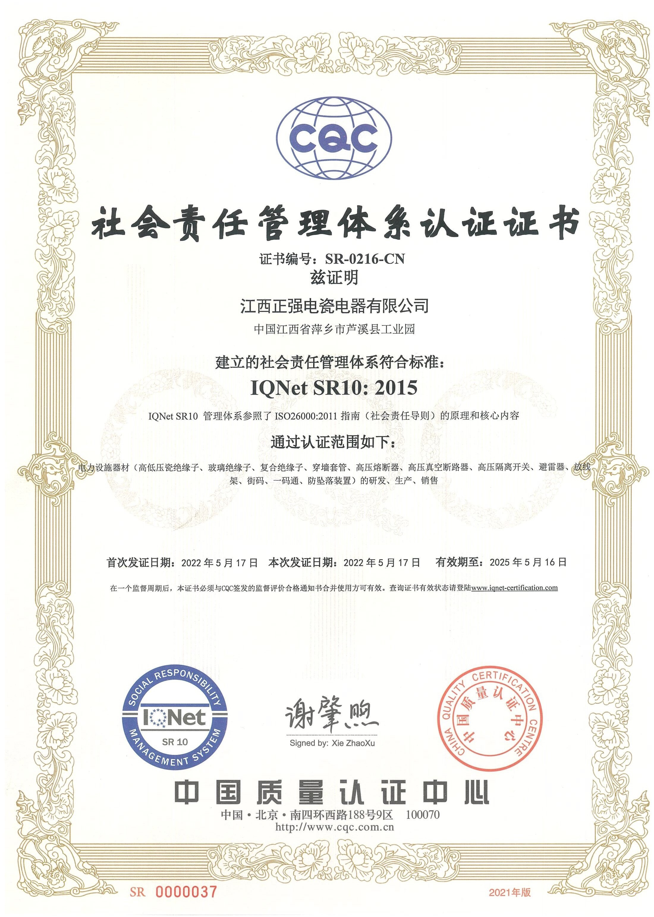 社会责任管理体系认证证书
