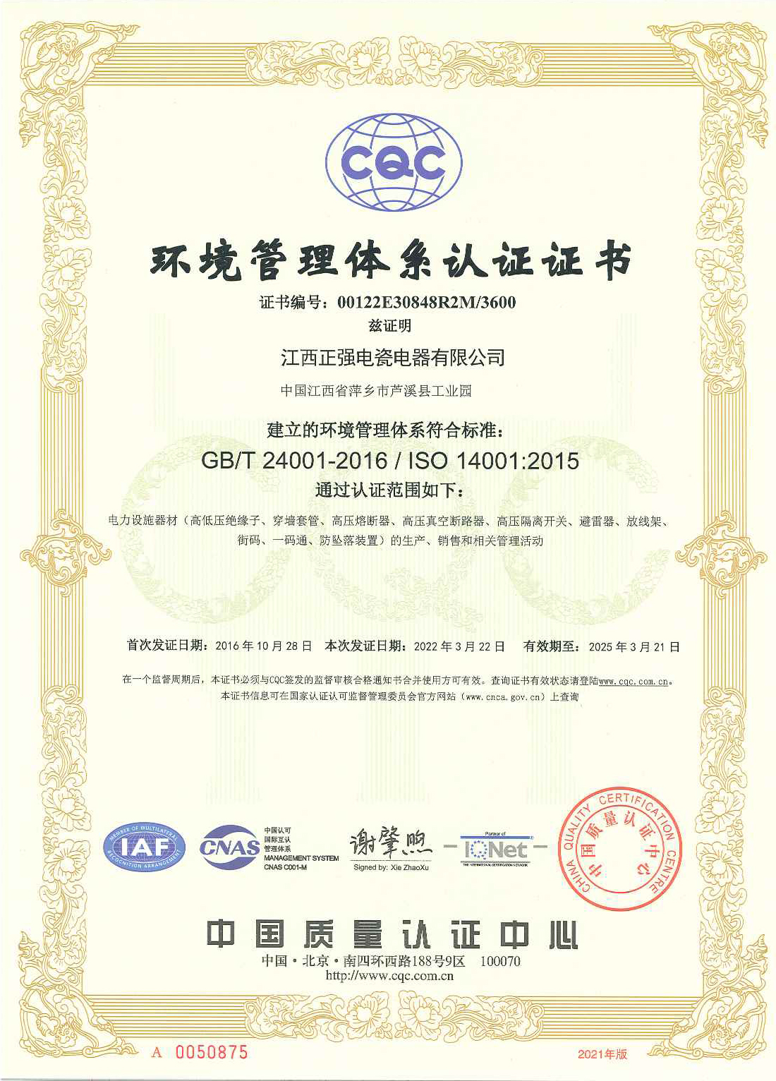 环境管理体系认证证书
